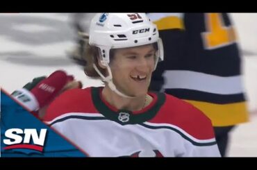 Regardez l’attaquant des Devils du New Jersey Dawson Mercer marquer avec frénésie devant pour compléter son premier tour du chapeau…