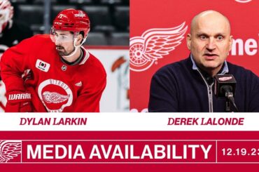 Lucas Raymond, Alex Lyon et Derek Lalonde parlent avec les médias après l’entraînement matinal des Red Wings au Little Caesars…