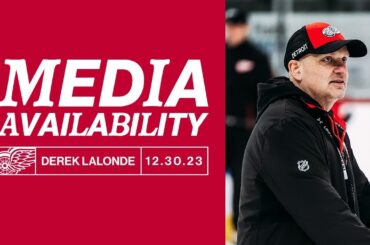 L’entraîneur-chef Derek Lalonde s’entretient avec les médias après l’entraînement de Détroit le samedi 30 décembre 2023.