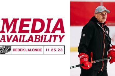 L’entraîneur-chef des Red Wings, Derek Lalonde, s’entretient avec les médias après l’entraînement de samedi au centre d’entraînement BELFOR, à l’intérieur…