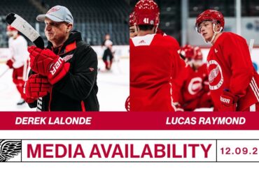 Lucas Raymond et Derek Lalonde parlent avec les médias après l’entraînement matinal de Détroit au Little Caesars Arena le samedi…