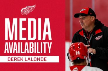 L’entraîneur-chef des Red Wings, Derek Lalonde, s’entretient avec les médias après l’entraînement de vendredi au centre d’entraînement BELFOR, à l’intérieur…