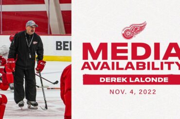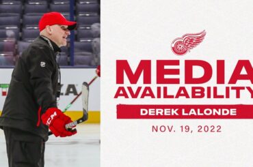 L’entraîneur-chef des Red Wings, Derek Lalonde, s’entretient avec les médias après l’entraînement matinal au Nationwide Arena le samedi 19 novembre…