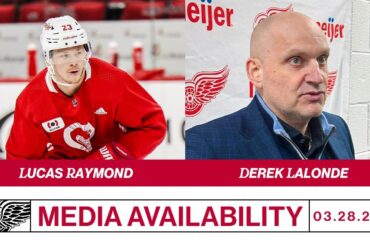 Lucas Raymond et Derek Lalonde parlent avec les médias après l’entraînement matinal des Red Wings, le jeudi 28 mars 2024,…