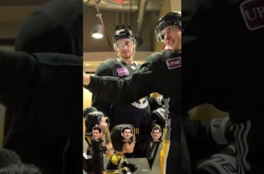 Les joueurs des Penguins examinent les figurines cadeaux de la saison 2023.24 pour déterminer lesquelles ressemblent le plus à leurs…