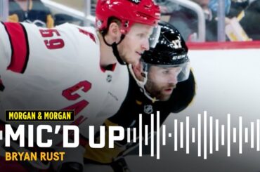 Le 26 mars 2024, Bryan Rust portait un micro alors que Jake Guentzel revenait pour la première fois en tant…