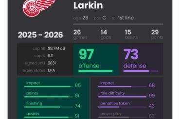 Dylan Larkin est tombé d’une falaise dans la seconde moitié de la saison. Seulement 4 points à 5 contre 5…