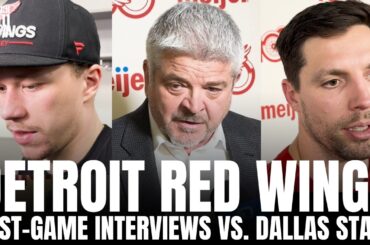 Lucas Raymond, David Perron et Todd McLellan parlent aux médias après le match de Détroit contre les Stars de Dallas,…