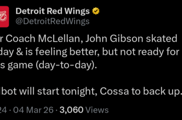 MISE À JOUR : Les Red Wings ont rappelé Sebastian Cossa des Griffins de Grand Rapids de la AHL dans…