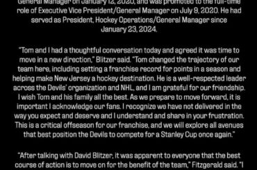Lettre des Devils du New Jersey concernant le licenciement du directeur général Tom Fitzergald — Electrical_Travel363