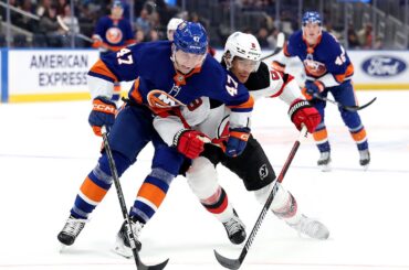 Alors que les Devils traînent les Islanders 5-0, un partisan des Devils lance un maillot sur la glace, qui se…