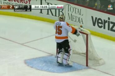Le gardien des Flyers de Philadelphie, Steve Mason, prend une pause pour boire de l’eau au milieu du jeu après…
