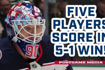 Elvis Merzlikins, Denton Mateychuk et l’entraîneur-chef Dean Evason parlent aux médias après la victoire 5-1 de ce soir à Dallas !…