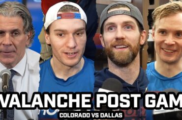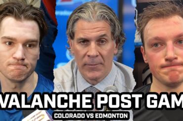 Jared Bednar, Cale Makar et Jonathan Drouin Conférence de presse dans les vestiaires après la défaite à domicile contre Connor…