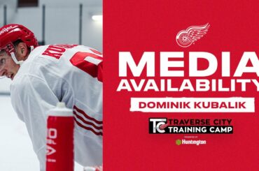 Dominik Kubalik s’entretient avec les médias après le match rouge contre blanc au Center Ice Arena de Traverse City, MI…