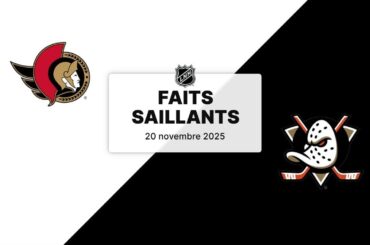 Voyez tous les faits saillants du match du jeudi 20 novembre opposant les Sénateurs d’Ottawa aux Ducks d’Anaheim