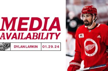 Dylan Larkin s’entretient avec les médias après l’entraînement de Détroit au centre d’entraînement BELFOR le lundi 29 janvier 2024.