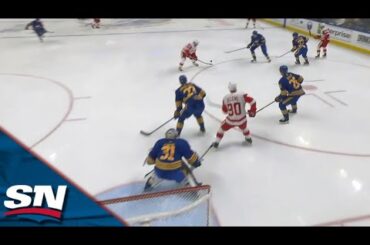 Regardez Dylan Larkin arracher un tir sur réception sur une rondelle en vol renversée devant Eric Comrie et donner aux…