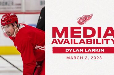 Dylan Larkin s’entretient avec les médias après le patinage matinal #RedWings à la Little Caesars Arena.
