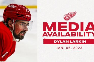 Le centre des Red Wings Dylan Larkin s’entretient avec les médias après l’entraînement matinal au Little Caesars Arena le vendredi…