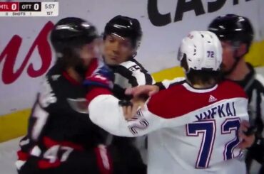 Arber Xhekaj des Canadiens de Montréal est pénalisé de deux minutes pour avoir brutalisé Mark Kastelic des Sénateurs d’Ottawa à…