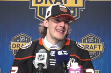 Le défenseur des Flint Firebirds Tristan Bertucci rencontre les médias à Nashville après avoir été sélectionné 61e au total par…