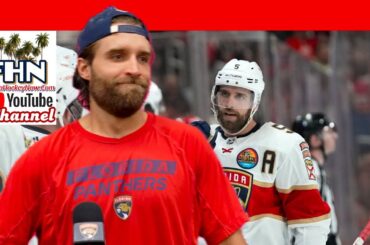 Le défenseur des Panthers de la Floride, Aaron Ekblad, rencontre les médias le 12 avril 2025, pour la première fois…