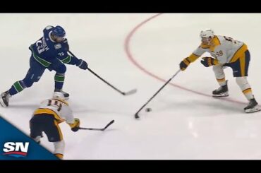 Regardez Elias Lindholm des Canucks de Vancouver marquer le premier but des séries éliminatoires au Rogers Arena depuis 2015 pour…