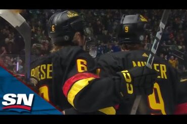 Regardez JT Miller et Elias Lindholm marquer des buts consécutifs dans les 10 premières minutes pour donner aux Canucks de…