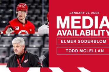 Moritz Seider, Elmer Soderblom et Todd McLellan parlent avec les médias après le match des Red Wings contre les Hurricanes…