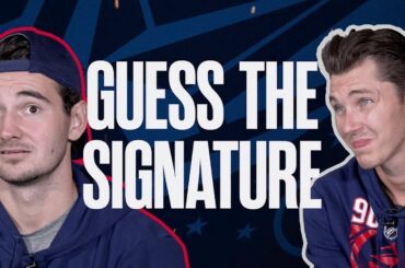 Erik Gudbranson, Elvis Merzlikins, Alexandre Texier, Mathieu Olivier, Zach Werenski, Boone Jenner et Cole Sillinger tentent de deviner la signature…