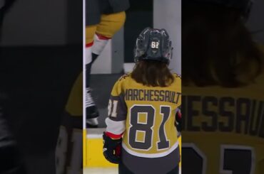 Vegas Golden Knights Jonathan Marchessault reste sur le banc lors du 1er entracte pour voir son fils William Marchessault jouer…