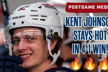 L’entraîneur-chef Dean Evason, Kent Johnson, Elvis Merzlikins, Ivan Provorov et James van Riemsdyk parlent aux médias après la victoire de…