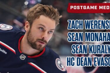 Zach Werenski, Sean Monahan, Sean Kuraly et l’entraîneur-chef Dean Evason s’adressent aux médias après le match. Suivez le #CBJ sur…