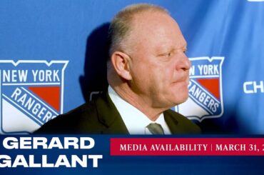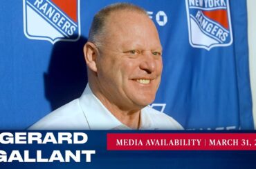 L’entraîneur-chef des Rangers de New York, Gerard Gallant, répond aux questions des médias après le match du 31 mars contre…