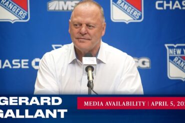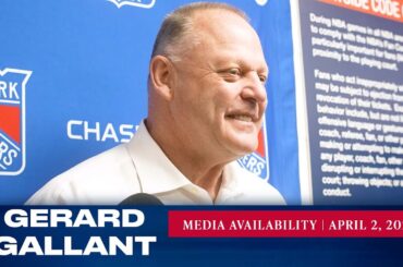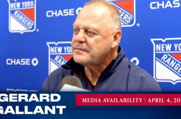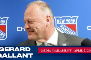 L’entraîneur-chef des Rangers de New York, Gerard Gallant, répond aux questions des médias après l’entraînement du 4 avril. » Abonnez-vous…