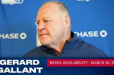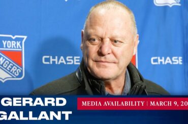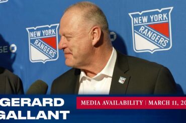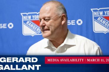 L’entraîneur-chef des Rangers de New York, Gerard Gallant, répond aux questions des médias après l’entraînement du 10 mars. » Abonnez-vous…