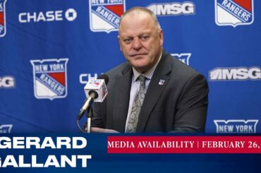 L’entraîneur-chef des Rangers de New York, Gerard Gallant, répond aux questions des médias avant le match du 26 février contre…