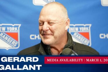 L’entraîneur-chef des Rangers de New York, Gerard Gallant, répond aux questions des médias avant le match du 1er mars contre…