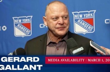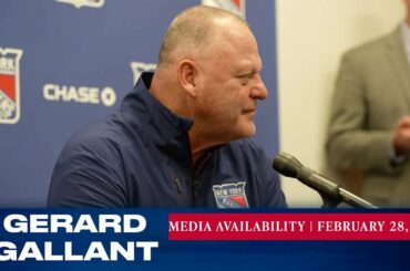 L’entraîneur-chef des Rangers de New York, Gerard Gallant, répond aux questions des médias après l’entraînement du 28 février. » Abonnez-vous…