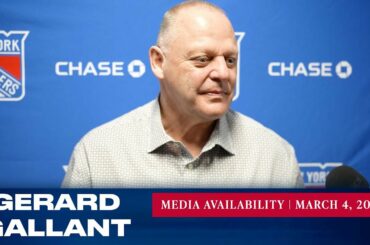 L’entraîneur-chef des Rangers de New York, Gerard Gallant, répond aux questions des médias avant le match du 4 mars contre…