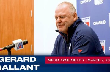 L’entraîneur-chef des Rangers de New York, Gerard Gallant, répond aux questions des médias après l’entraînement du 7 mars. » Abonnez-vous…