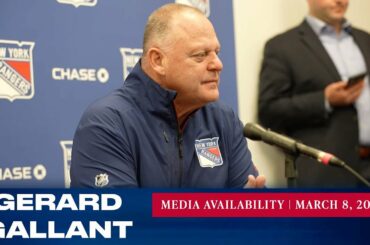 L’entraîneur-chef des Rangers de New York, Gerard Gallant, répond aux questions des médias après l’entraînement du 8 mars. » Abonnez-vous…