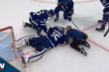 Rasmus Dahlin frappe TJ Brodie par derrière et cela conduit à des bagarres après le jeu. Les dix joueurs sur…