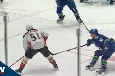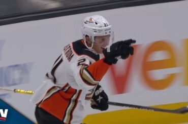 Regardez le défenseur des Ducks d’Anaheim Olen Zellweger recevoir une passe d’Isac Lundestrom et tirer sur le côté court, par-dessus…