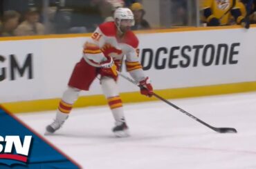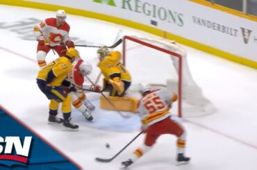 Regardez Nazem Kadri des Flames de Calgary attendre le défenseur puis réussir par Juuse Saros des Predators de Nashville pour…