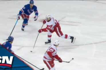 Le défenseur des Red Wings de Détroit Moritz Seider marque depuis le point en avantage numérique, puis 23 secondes plus…
