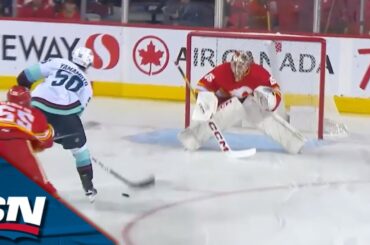 L’attaquant du Seattle Kraken, Kailer Yamamoto, inscrit son septième but de la saison, retirant le tir du poignet après un…