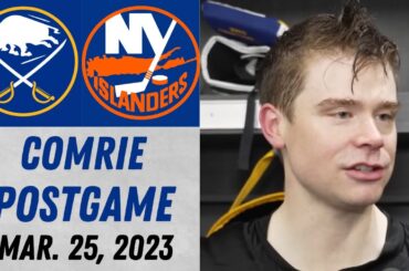 Le gardien de but des Sabres de Buffalo, Eric Comrie, s’est adressé aux médias le 25 mars 2023 après avoir…