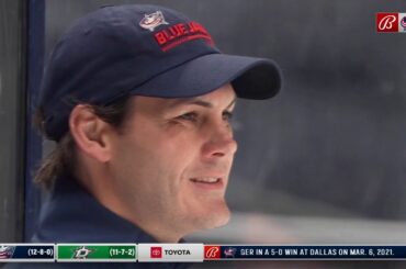 In @Blue Jackets de Columbus Gregory Hofmann marque son premier but dans la LNH lors de la victoire des Blue Jackets de Columbus contre les Stars de Dallas octobre 26, 2021 Hofmann discute avec Jody Shelley après la victoire 4-1 des Blue Jackets contre les Stars au Nationwide Arena et applaudit…